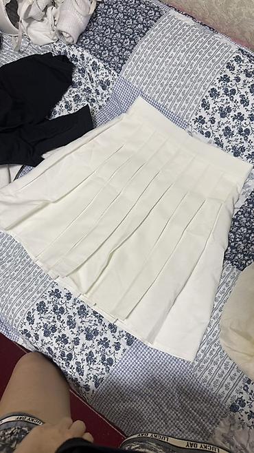 - Белая плиссированная мини-юбка с широким поясом и ровными складками по всему периметру.