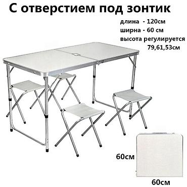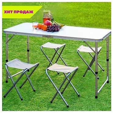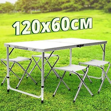Комплект стол складной туристический 120*60 см и 4 стула. Стулья складываются внутрь стола, что удобно для переноски и хранения.