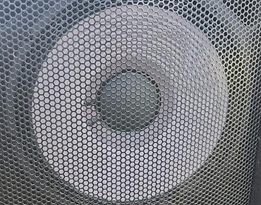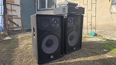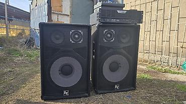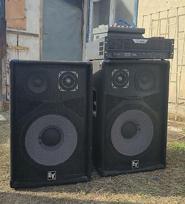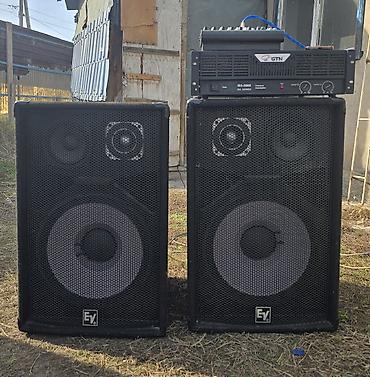 - Пара напольных акустических систем EV (Electro‑Voice) с защитными металлическими грилями. Двухполосная конфигурация: НЧ динамики большого диаметра и ВЧ драйверы в рупоре для направленного излучения.