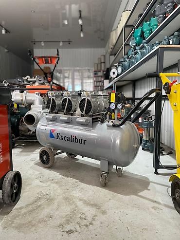 Компрессор Excalibur 100 L Основные характеристики, указанные на корпусе: - Объем ресивера: 100 литров - Тип: безмасляный (oil free), двухполюсный - Конфигурация: три компрессорные головки - Давле...