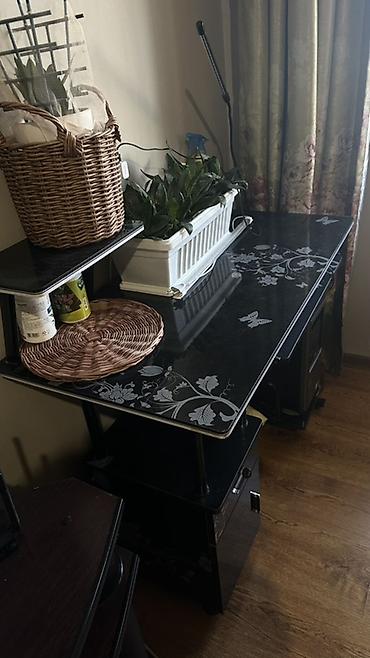 Компьютерный стол со стеклянной столешницей и полками - Цвет: черный с декоративным рисунком на столешнице (растительный орнамент, бабочки). - Материал: верхняя столешница — закаленное стекло; опо...