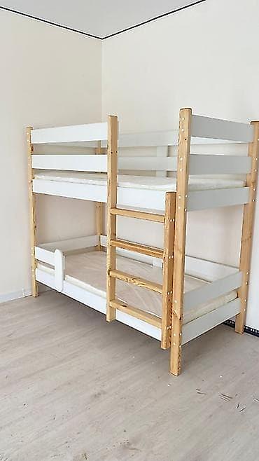 - Каркас: ЛДСП в тёплых древесных оттенках с белыми фасадами; защитные бортики на верхнем ярусе.