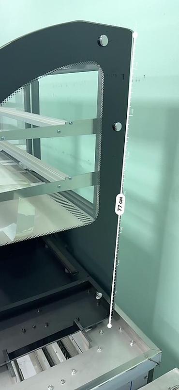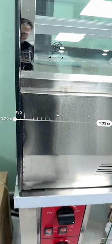 - Габариты по замерам на фото: длина около 1,32 м, глубина рабочей зоны ~42 см, высота экспозиционной части ~77 см