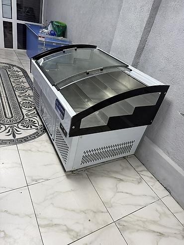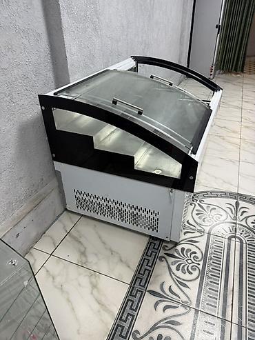 - Горизонтальная витрина с изогнутым стеклом и раздвижными верхними створками с ручками.