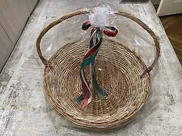 Плетёная корзина с ручкой в подарочной упаковке. - Материал: натуральная лоза (ротанг/ива), плотное классическое плетение. - Форма: круглая, с высокой дугообразной ручкой для удобной переноски. - ...
