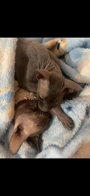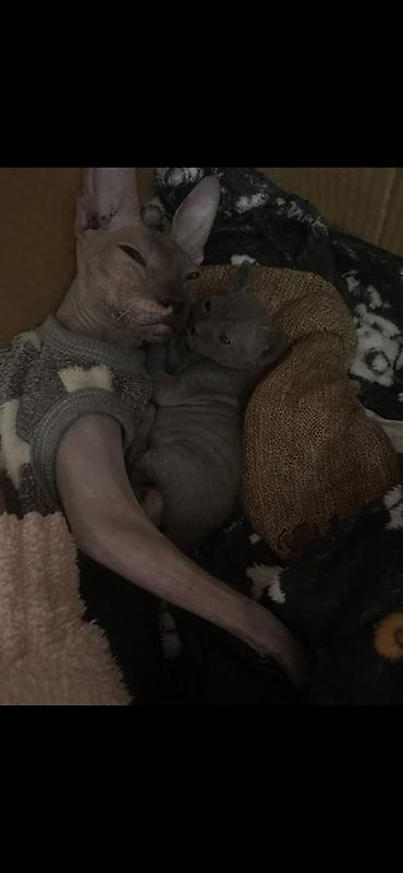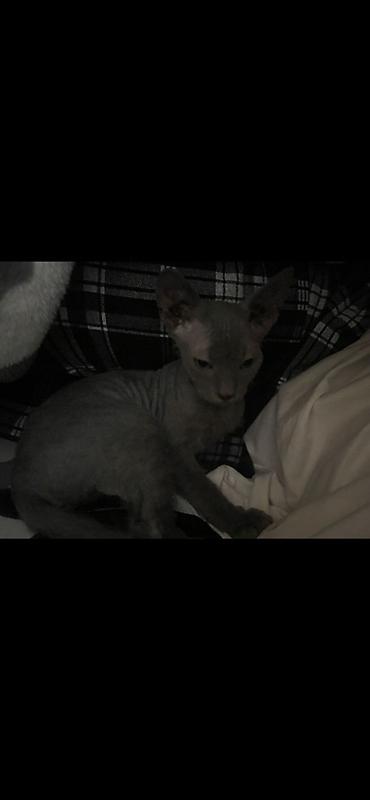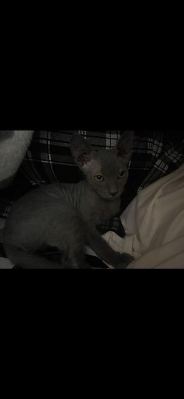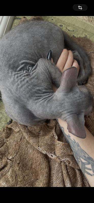 - Окрас: ровный серый (голубой). На фото видно бархатистый налёт пуха, характерный для сфинксов.