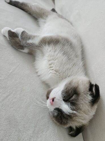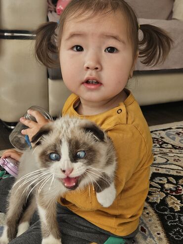 Котёнок с голубыми глазами и ярким сиамским окраcом (белые носочки, белая маска на мордочке, розовый нос). Полукороткошёрстный, мягкая плотная шерсть, округлые черты мордочки. Ушки небольшие, слегка прижатые, хвост тёмный с осветлением к основанию.