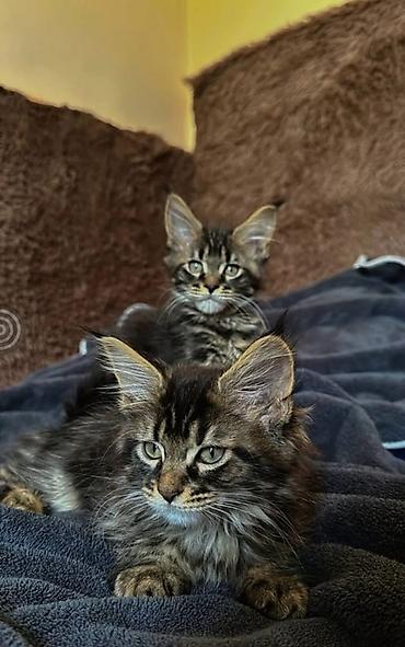 - Окрас: классический тикированный/полосатый табби (черный с коричневым), выразительные «рысьи» кисточки на ушах, пушистые воротнички и хвосты.