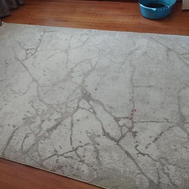 Ковёр с абстрактным мраморным рисунком в оттенках серого, бежевого и светло-голубого. Большой прямоугольный формат — визуально закрывает почти всю площадь гостиной/спальни; хорошо смотрится на свет...