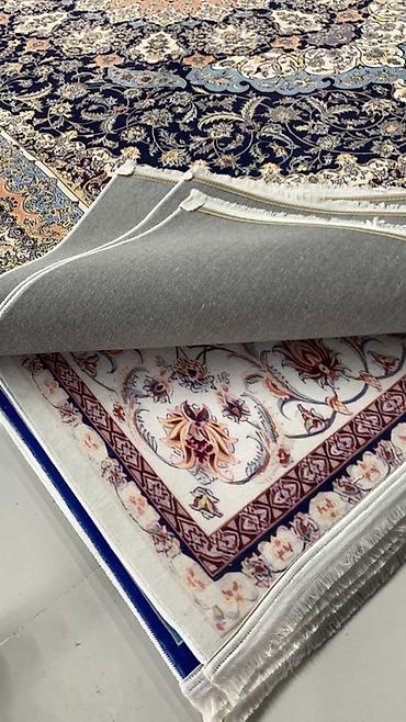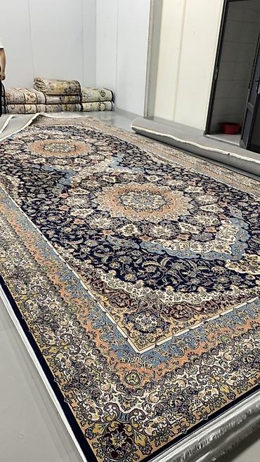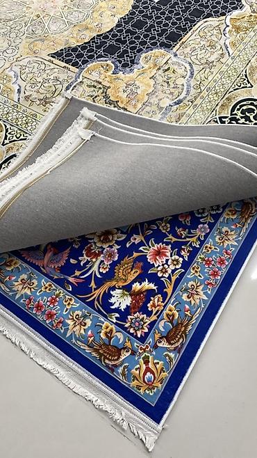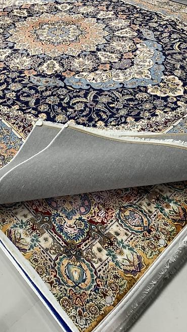 - Классический персидский рисунок с центральной медальоном и растительными мотивами. Глубокий тёмно‑синий фон с акцентами бежевого, терракотового и небесно‑голубого.