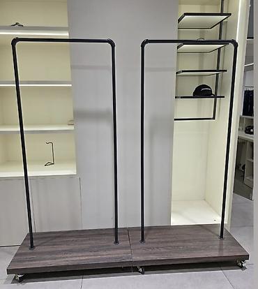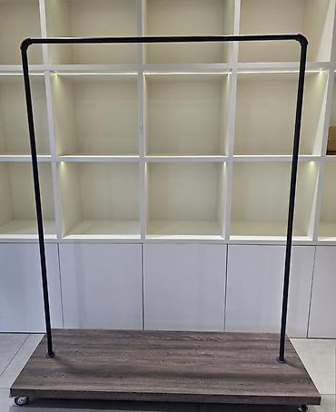 - Напольные стойки-рейлы на колесах для подвеса одежды. Прямоугольная рама из черного металла, основание из ЛДСП под темное дерево. Колесики поворотные, с тормозами — удобно перемещать по залу и выставлять в линию.