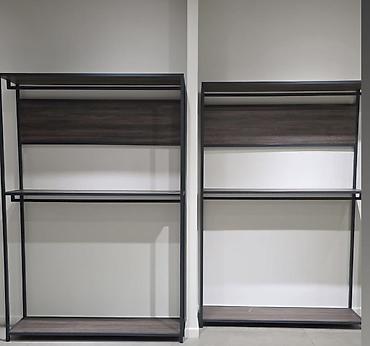 - Настенные модульные системы: металлический каркас в матовом черном, нижняя полка-подиум и верхняя полка из ЛДСП в том же декоре. Предусмотрена перекладина для вешалок и широкая зона для экспонирования длинных вещей.
