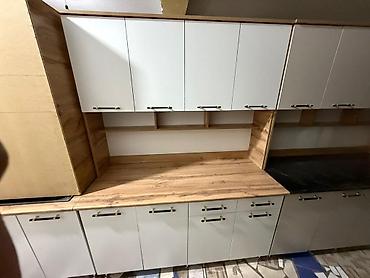 Доступны различные конфигурации и сочетания отделок: белый матовый + дуб, полностью «дерево», столешницы под камень или дуб.