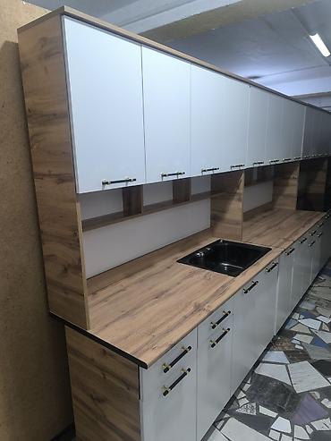 - Современный прямой комплект со встроенной столешницей под дерево и фартуком в тон.