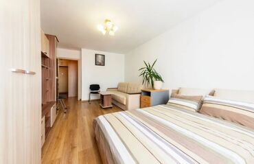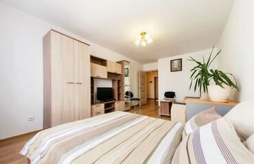 - Просторная светлая комната: двуспальная кровать с комплектом постельного белья, диван, ТВ, шкаф-купе и стеллаж для хранения.