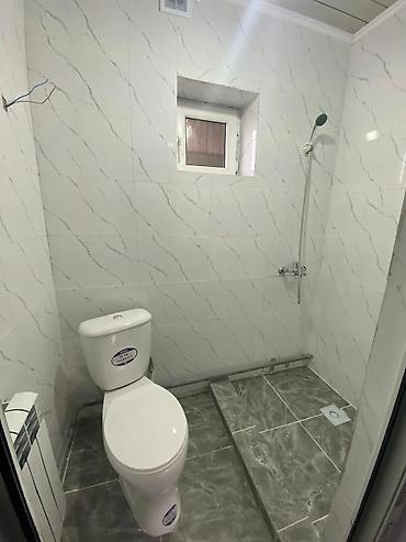 - Санузел совмещённый: душевая зона с подиумом и трапом, душевая стойка, унитаз, керамическая плитка на стенах и полу, вентиляция и окно.