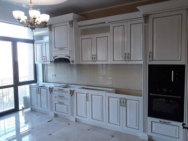 - Светлая кухня с панорамным окном и выходом на лоджию/французский балкон. Фасады классического стиля, встроенные места под технику, высокий модуль для духового шкафа, декоративные карнизы и фурнитура в едином стиле.