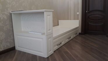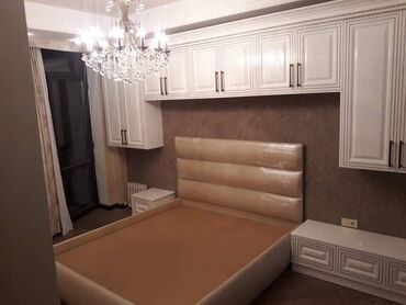 - Спальня с мягким изголовьем кровати, системой навесных шкафов по всей стене и прикроватными тумбами; хрустальная люстра, текстиль на окнах.