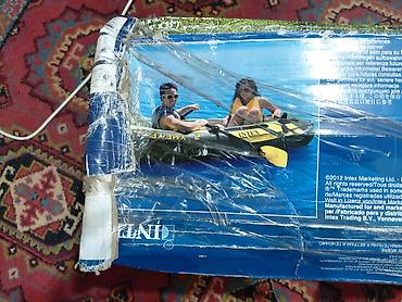 - В комплекте, судя по упаковке: разборные весла (пластиковые лопасти желтого цвета), ручной насос Intex, ремонтная заплата/набор, леерный шнур.