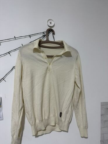 - Отдельно: светлый джемпер-поло кремового цвета с длинным рукавом, планка на пуговицах, эластичные манжеты и низ.