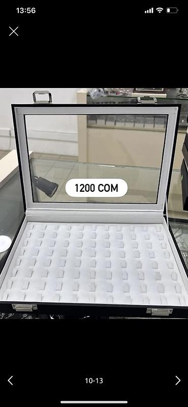 - Витринный кейс с прозрачной крышкой и замками, внутри — лоток с клипсами для серег/подвесок, белая обивка. Цена на фото: 1200 сом.