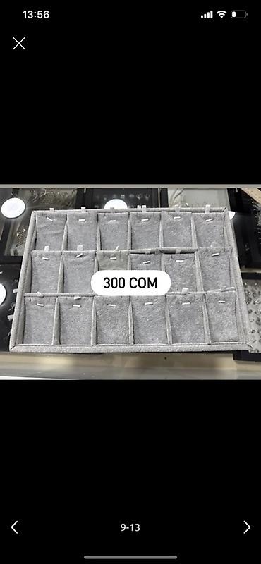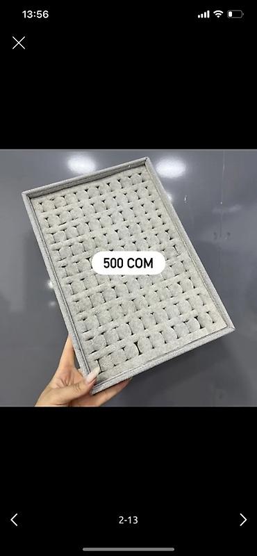 - Серый лоток с ячейками под серьги/подвесы. Мягкая велюровая отделка, множество отдельных секций с петлями-держателями. Цена на фото: 300 сом.