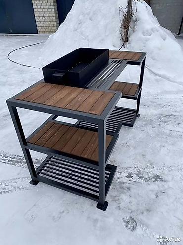 Металлические изделия для дачи и дома: мангалы и вольеры для птиц/грызунов Описание: - Стационарный мангальный стол из стали: жаровня с зубчатым краем и отверстиями под циркуляцию воздуха, площадк...