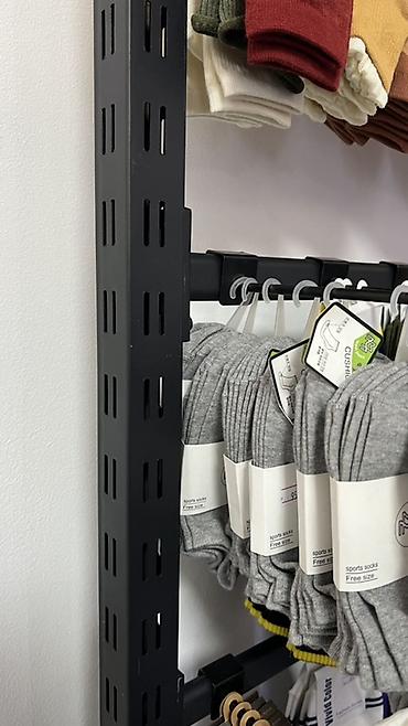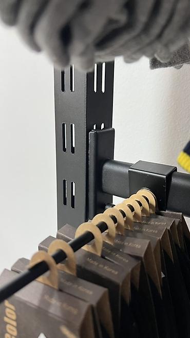 - Горизонтальные траверсы с крючьями/штангами для развески товара на хедерах и петлях.