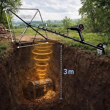Благодаря импульсной технологии прибор уверенно работает даже на сложных и минерализованных грунтах, обеспечивая стабильное обнаружение на глубине до 3-х метров. Большая рамочная катушка 80×80 см даёт широкое покрытие и максимальную глубину поиска - идеально для кладов, труб, сейфов и крупных целей.