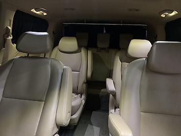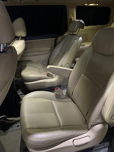 Kia Carnival/Sedona белого цвета — просторный 9местный минивэн с современным дизайном и удобным салоном бежево‑черного тона.