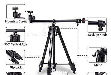 - Тип: алюминиевый штатив с центральной осью 360° и выдвижной горизонтальной штангой (boom/overhead).