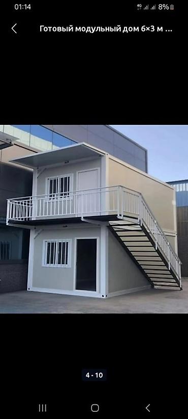 Комплектация по фото: готовый модуль с дверью, окнами, внутренним освещением и проводкой, чистовой отделкой стен и пола; возможна сборка нескольких модулей в линейку или этажность с наружными лестницами и перилами.