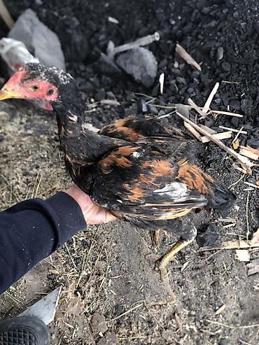 Петух боевого типа (возможно азиль/шамо): высокий, сухого телосложения, длинные ноги, мощная шея и выраженный гребень. Окраска смешанная: черно-бурые крылья и спина, темные перья на корпусе, рыжева...