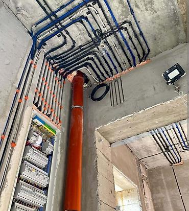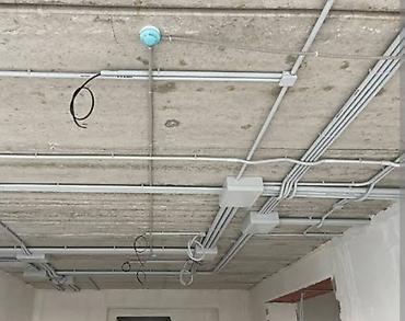- Полная разводка кабелей по потолку и стенам: в ПВХ/ПНД гофре и трубах, повороты под 90°, крепеж с шагом, аккуратные трассы и распределительные коробки.