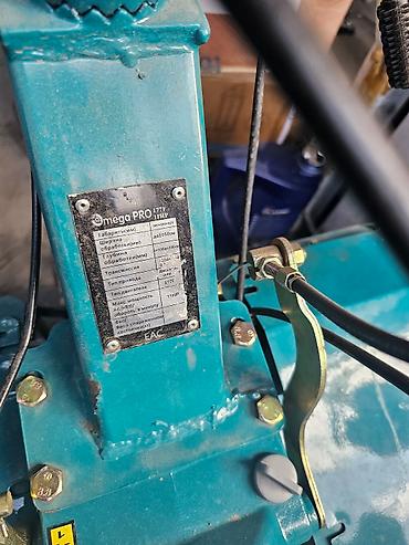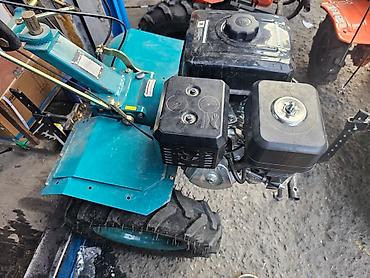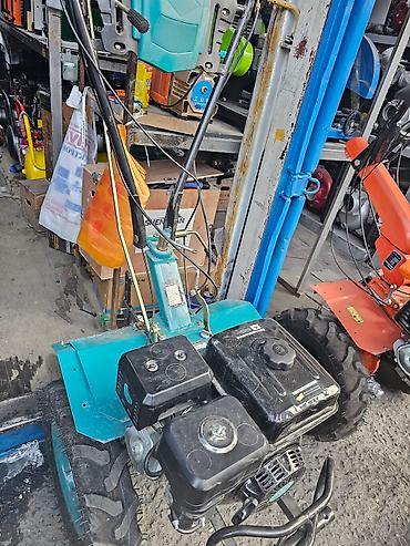 Мотоблок бирюзового цвета с черным двигателем. Оснащен двумя большими колесами с глубоким протектором для лучшего сцепления с поверхностью. На корпусе двигателя расположены два бака черного цвета. Рукоятки управления удобно расположены для оператора. Мотоблок предназначен для выполнения сельскохозяйственных работ, таких как вспашка, культивация, окучивание и другие.