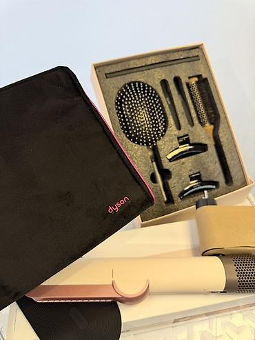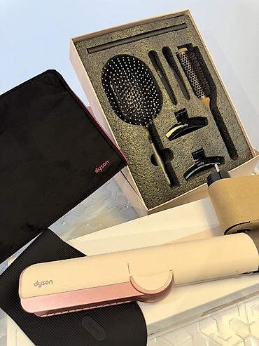 - Стайлер Dyson (цвет: кремово‑розовый) с насадкой-выпрямителем/щипцами в фирменном дизайне. Компактный корпус, решётка воздухозабора, эргономичная рукоятка. Термоковрик Dyson в комплекте для безопасного размещения горячего прибора.