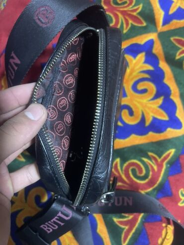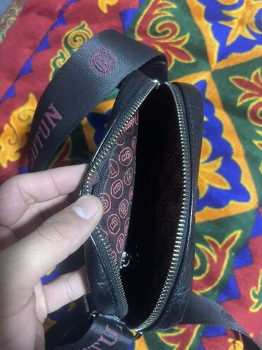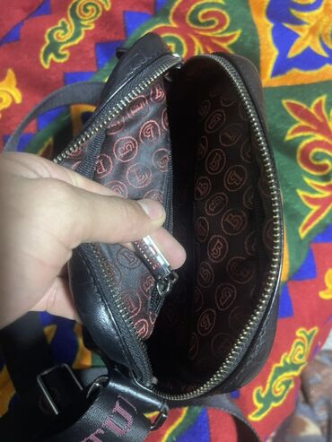 - Внутри: подкладка с монограммой, основное отделение + карман (видно на фото), металлическое кольцо/карабин для ключей