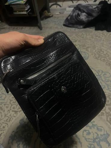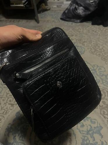 Мужская сумка через плечо (планшет) из черной кожи с фактурой «под крокодила».