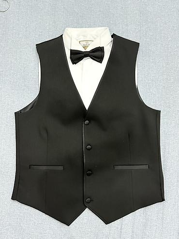 Комплект обеспечивает цельный нарядный образ: пиджак + брюки + жилет + бабочка.