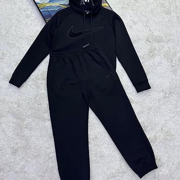 - Черный монохромный комплект с тональным логотипом Swoosh на худи и мини‑эмблемой на брюках.