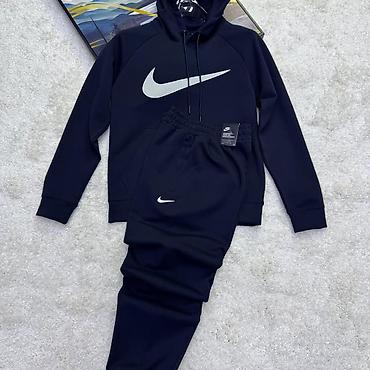 - Темно-синий комплект с крупным контрастным логотипом Swoosh на груди и мини‑логотипом на брюках.