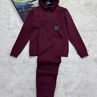 - Бордовый комплект Jordan: худи на молнии, фирменные логотипы на груди и на брючине.