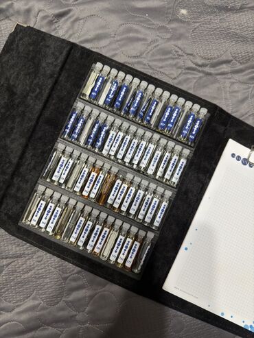 - Внутри — органайзер с несколькими рядами мини-флаконов (примерно 2–3 мл каждый) с плотными пробками.