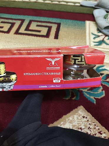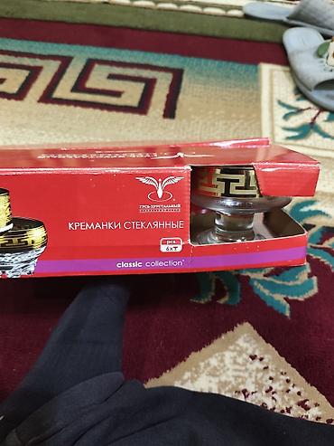 Также на коробке указаны «креманки стеклянные» (pcs: 6x) в том же стиле — на ножке, с золотистым ободом и прозрачным стеклом с узором.