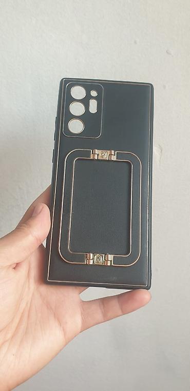 - Чехол с откидной металлической подставкой-рамкой. Материал — черный кожзам с матовой фактурой, окантовка и петли подставки золотистого цвета. Подставка фиксируется в нескольких положениях, подходит для горизонтального и вертикального просмотра. Усиленная рамка вокруг блока камер, вырезы под все разъемы и S Pen.