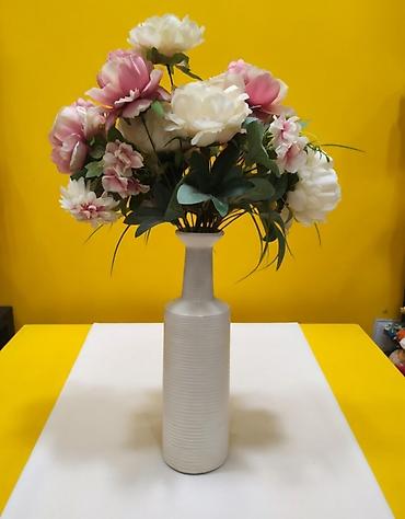 - Ваза: высокая, цилиндрическая с узким горлышком, горизонтальное рифление, светлый матовый цвет. Идеальна для размещения на консоли, каминной полке или обеденном столе.