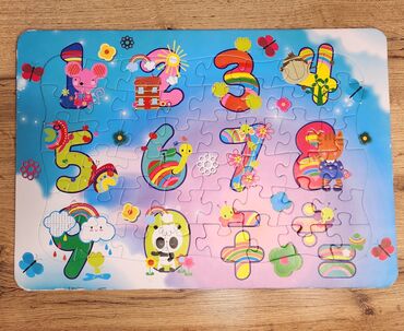 2) Обучающий пазл с цифрами 1–9 и математическими символами (+, =), яркие иллюстрации животных и предметов.