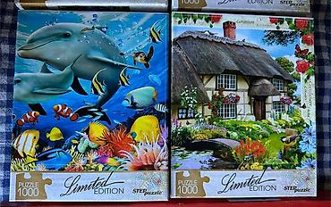 - STEP Puzzle, Limited Edition, 1000 деталей: «Английский коттедж и сад» — дом с соломенной крышей, цветники, пруд и птицы.