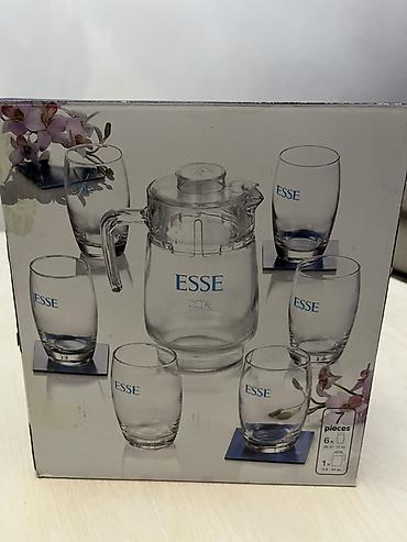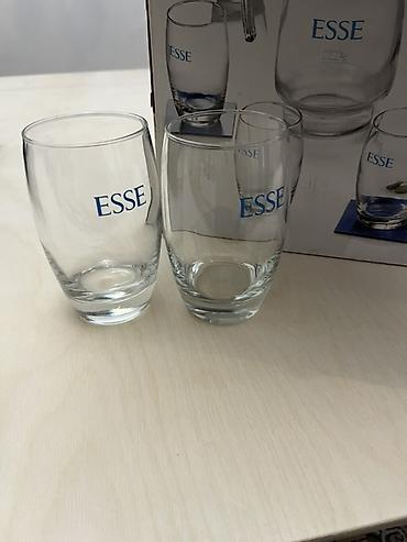 - Прозрачное закалённое стекло, классическая форма, логотип ESSE на каждом стакане и графине.