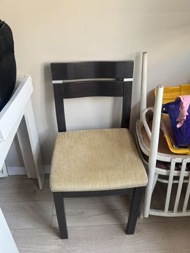 - 1 стул с темным деревянным каркасом: широкая спинка с декоративной вставкой, сиденье мягкое, тканевая обивка бежевого цвета. Универсальная модель для рабочего стола или кухни.